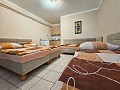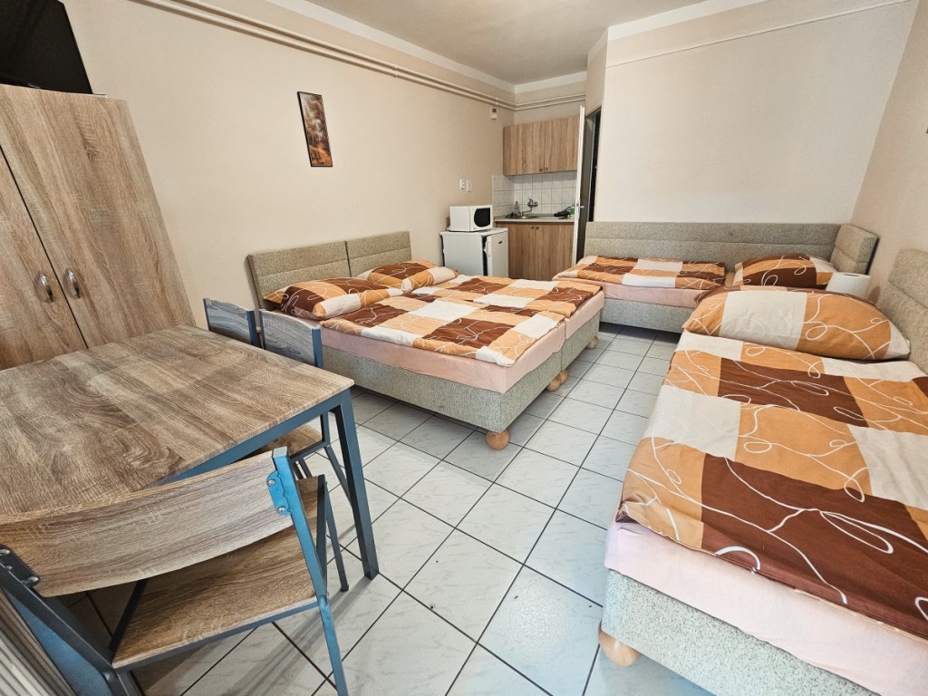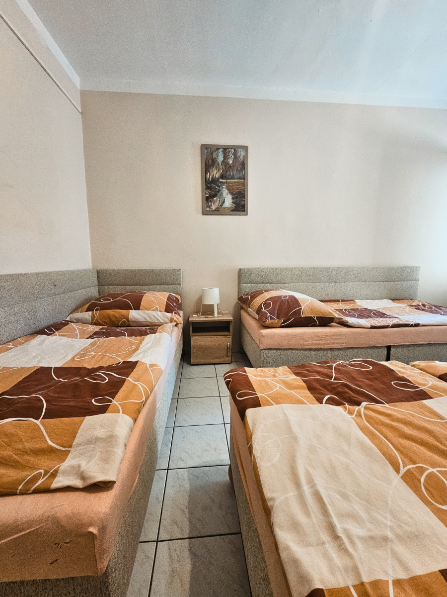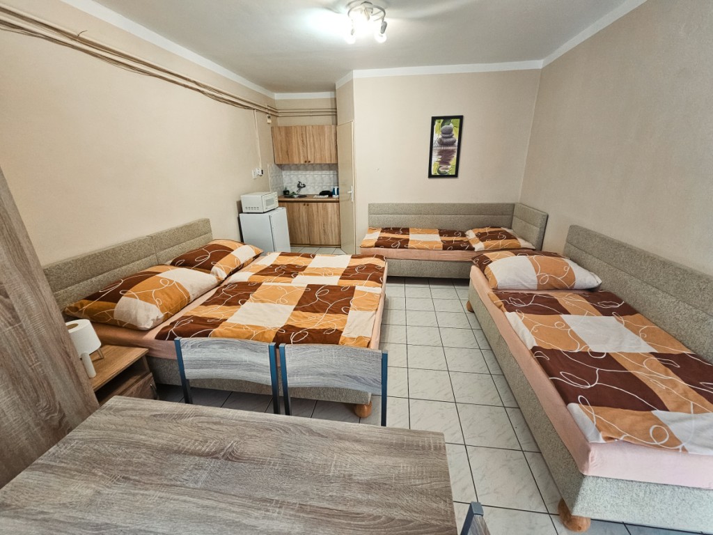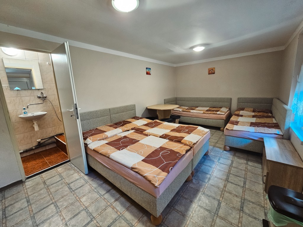 manželská posteľ a dve samostatné postele (posteľné prádlo k dispozícií), TV, kuchynský kút v izbe, mini chladnička, rýchlovarná kanvica, varič, mikrovlnka, umývadlo, vlastná kúpeľňa v izbe (sprchovací kút, WC v kúpeľni), samostatný vchod.
