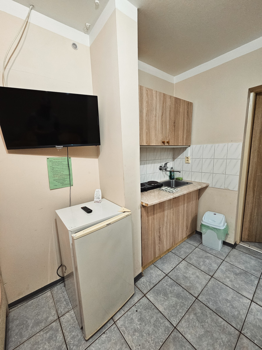 manželská posteľ (posteľné prádlo k dispozícií), TV, vlastná kúpeľňa v izbe (sprchovací kút, WC v kúpeľni), kuchynský kút na konci spoločnej chodby (chladnička, rýchlovarná kanvica, varič, mikrovlnka), spoločný vchod s inou izbou alebo s apartmánom.